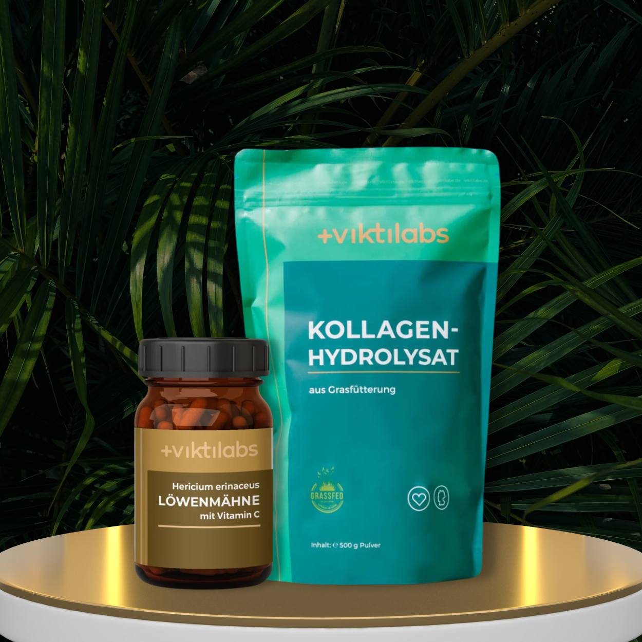 Optimal kombiniert: Kollagen trägt zur Aufrechterhaltung normaler Schleimhäute bei, während Löwenmähne wertvolle Inhaltsstoffe wie Polysaccharide bietet